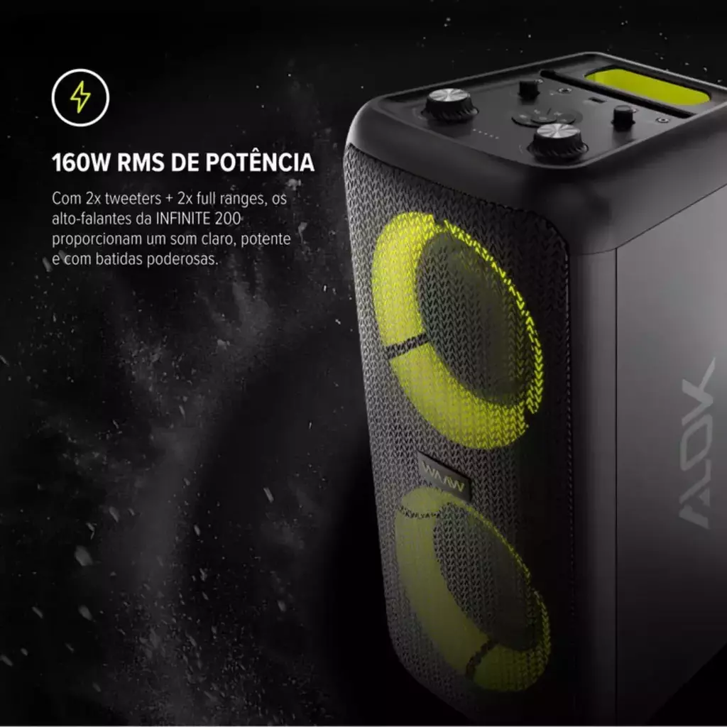 A Caixa de Som Sound Box Infinite 200 é a escolha perfeita para quem busca qualidade sonora e um toque visual moderno. Ideal para animar suas festas ou aproveitar a música no seu dia a dia com muito mais estilo.